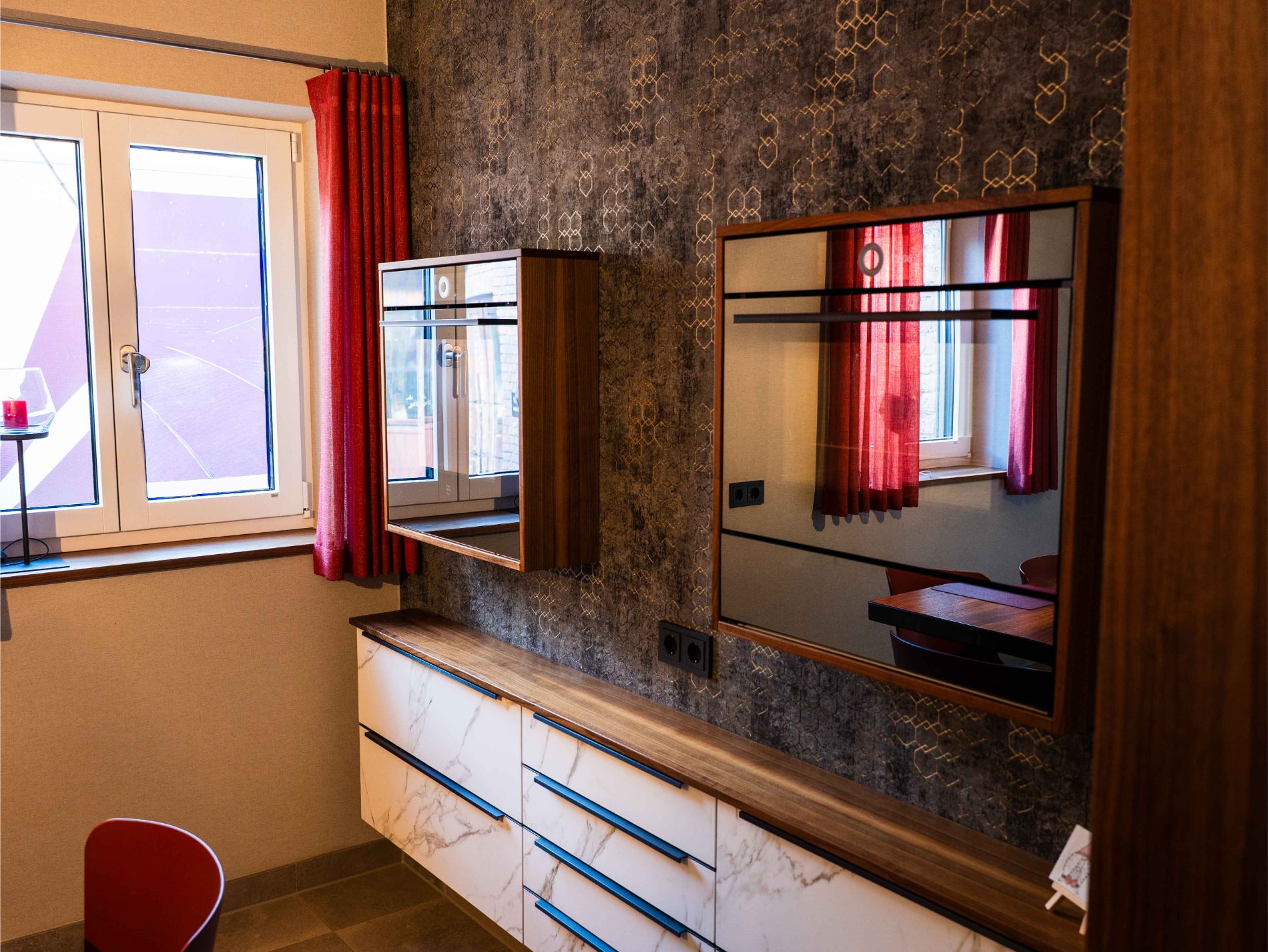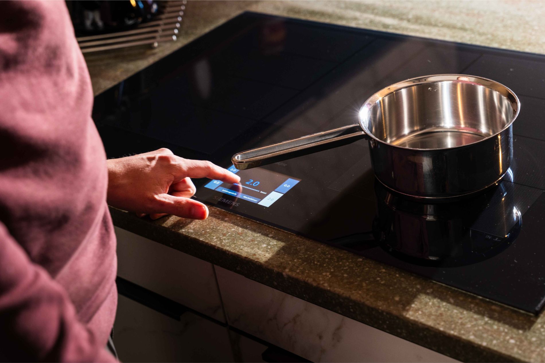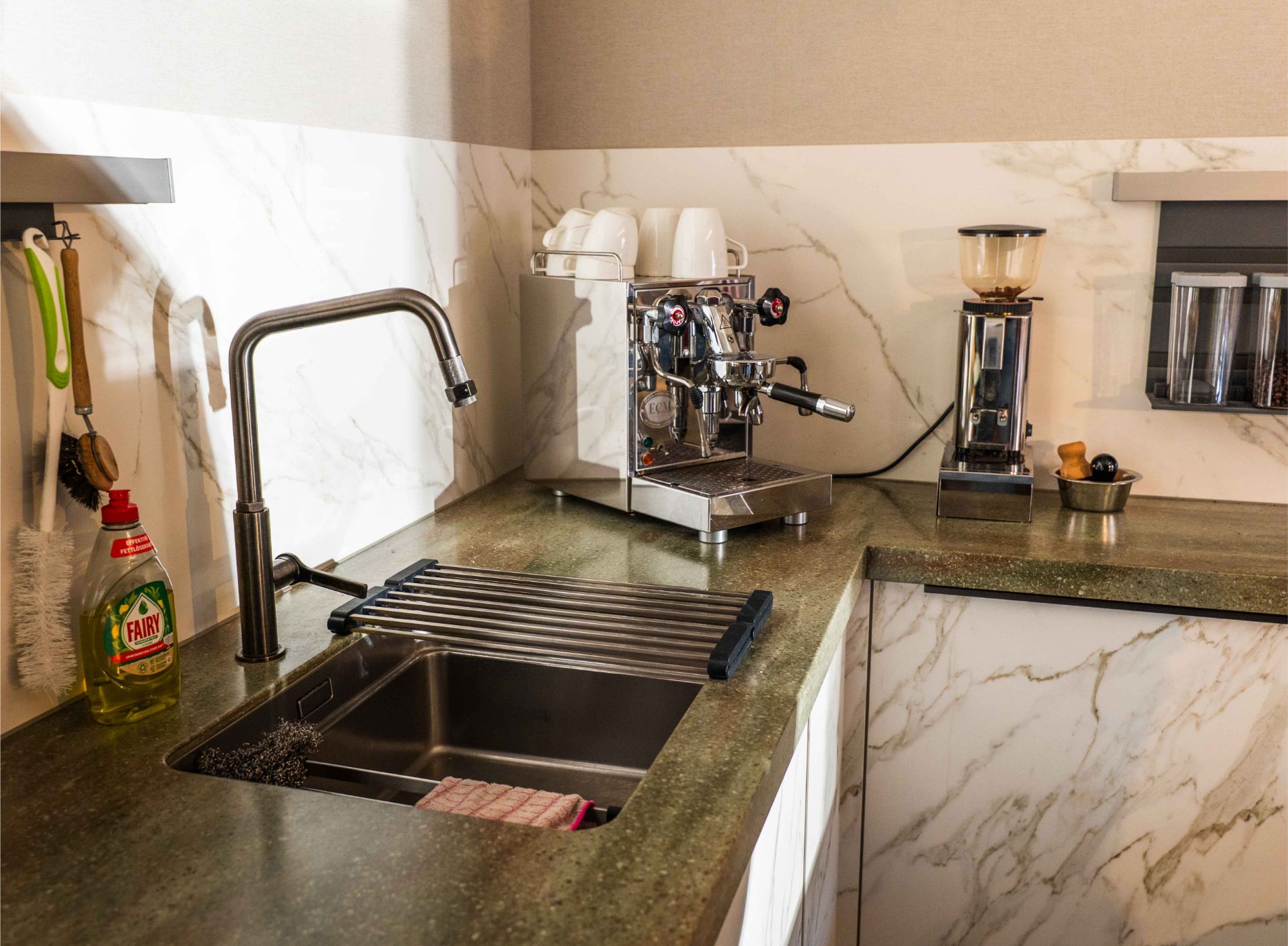 Grifflosen Fronten in Marmoroptik, warme Holzelemente und eine strukturierte Akzentwand verleihen dem Raum eine exklusive Atmosphäre. Der separate Barista-Bereich mit Siebträgermaschine und Mühle ist ideal für Kaffeeliebhaber. Ein innovatives Siemens-Induktionskochfeld mit Touch-Display sorgt für moderne Bedienung und hohe Kochpräzision.
