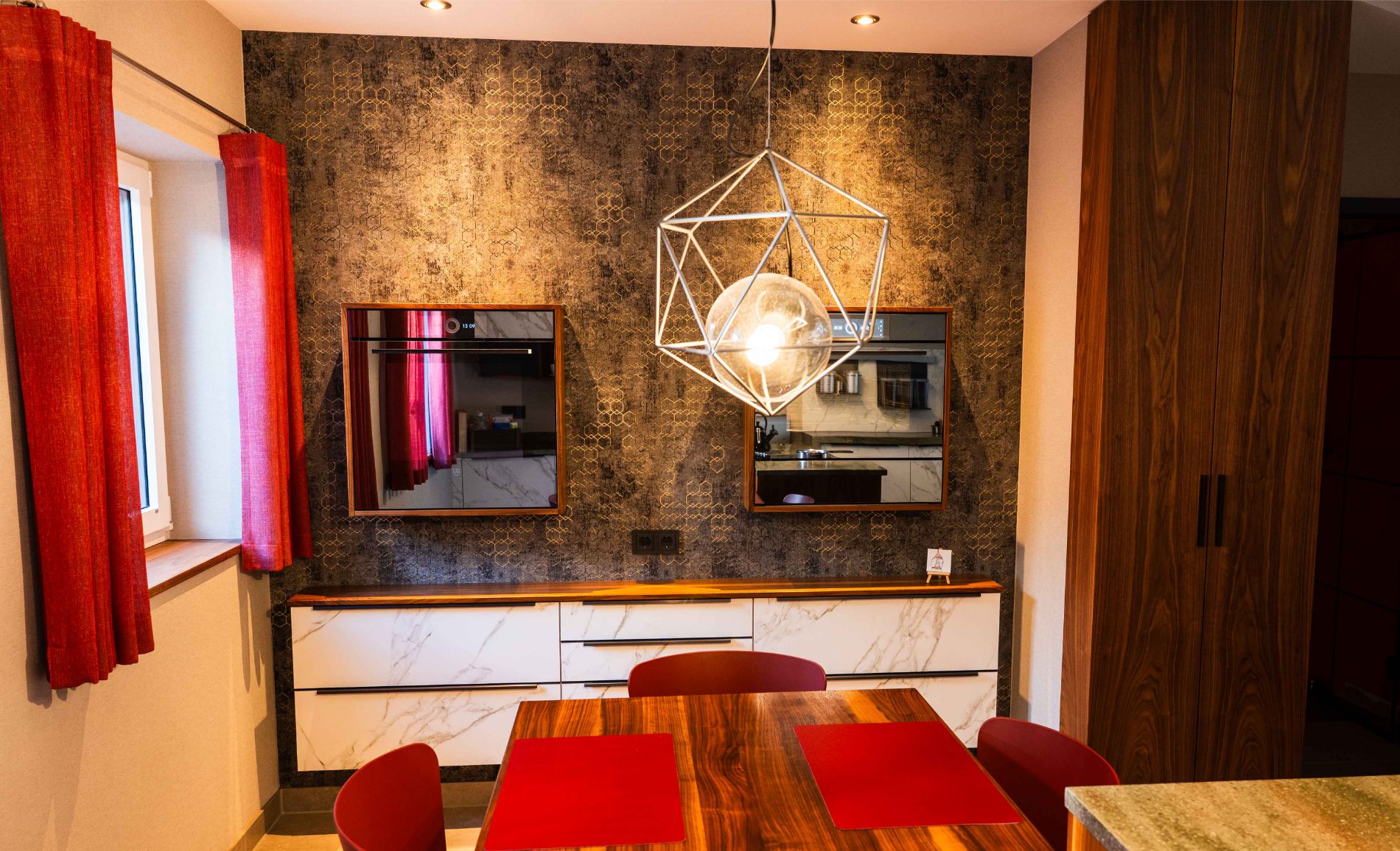 Der Essbereich mit massivem Holztisch, roten Akzenten und designstarker Pendelleuchte rundet das elegante Gesamtbild ab und macht die Küche zum stilvollen Mittelpunkt des Hauses.