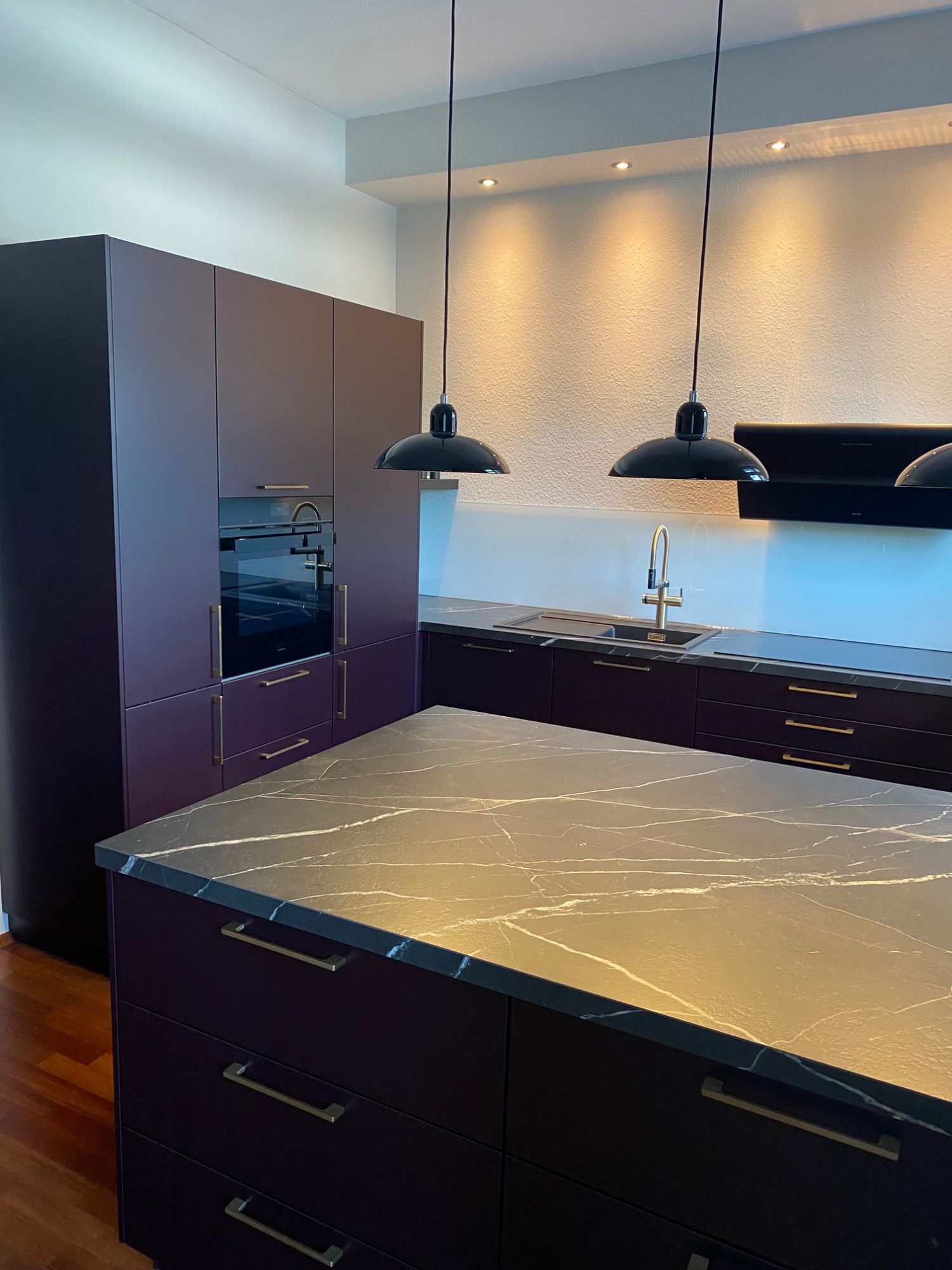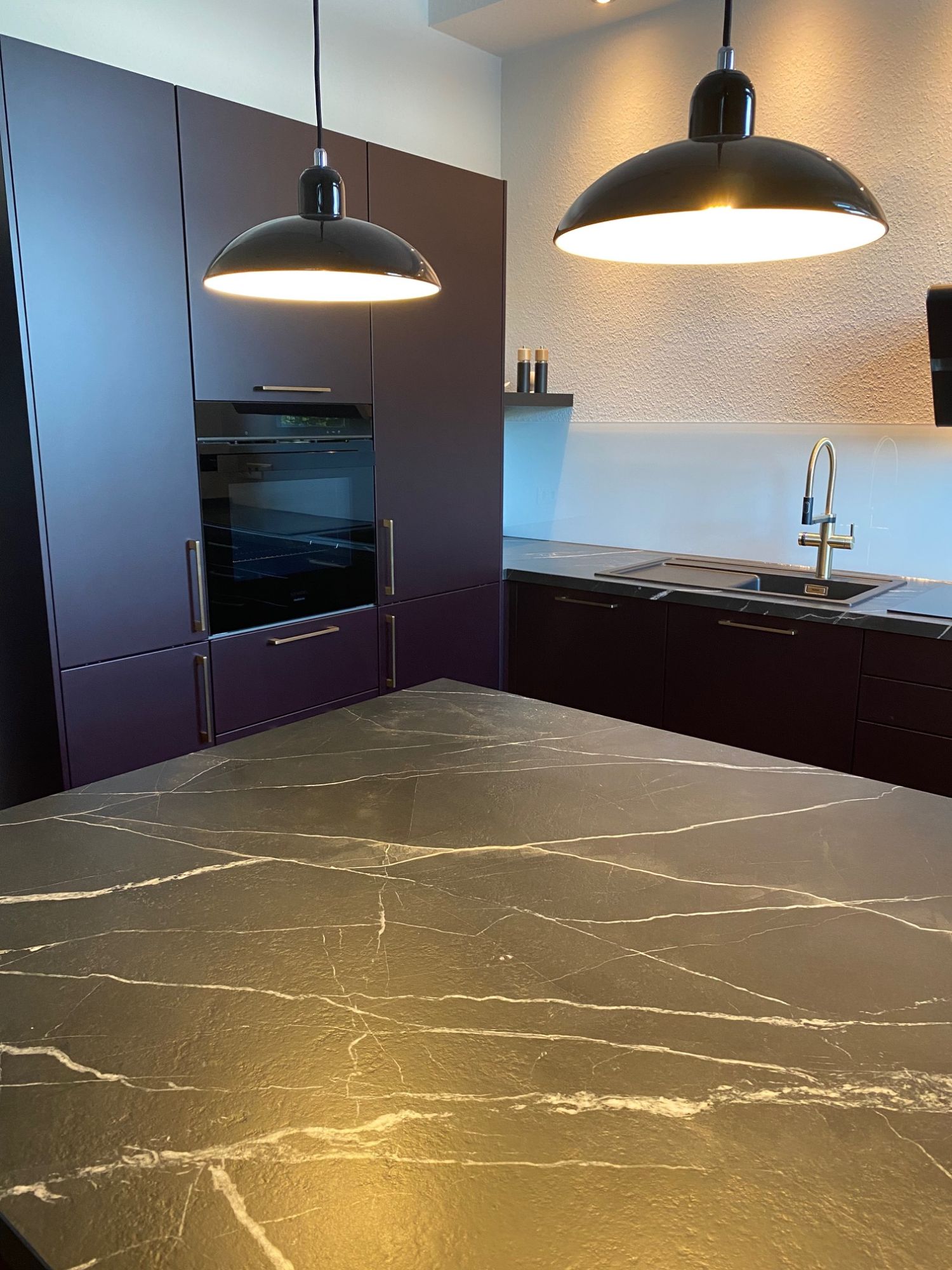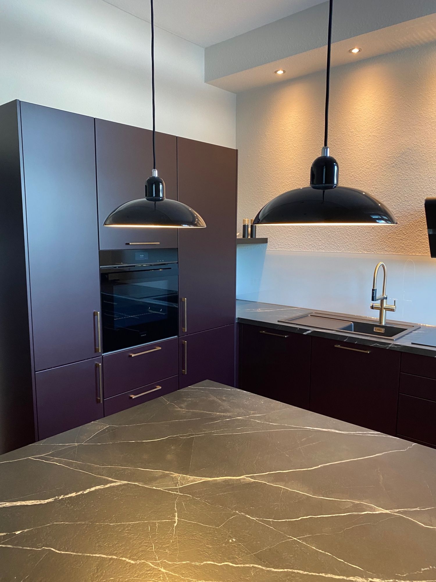 Die dunklen, matten Fronten im Farbton Blackberry setzen ein klares Statement und verleihen der Küche eine exklusive Note. Harmonisch ergänzt wird das Design durch die edel marmorierte Keramik-Arbeitsplatte der Firma Laminam in Calacatta Black, deren feine, helle Maserungen einen stilvollen Kontrast bilden.