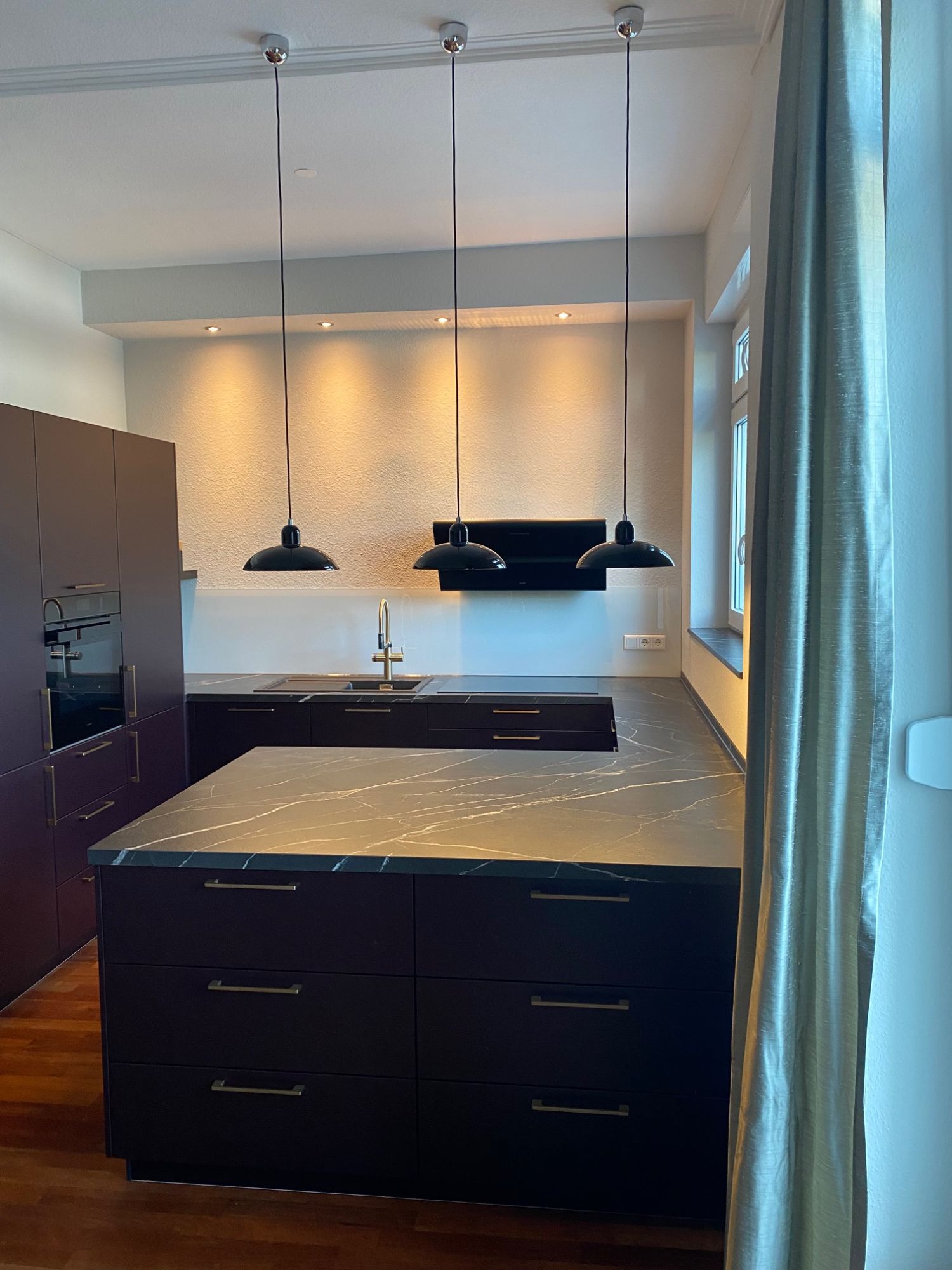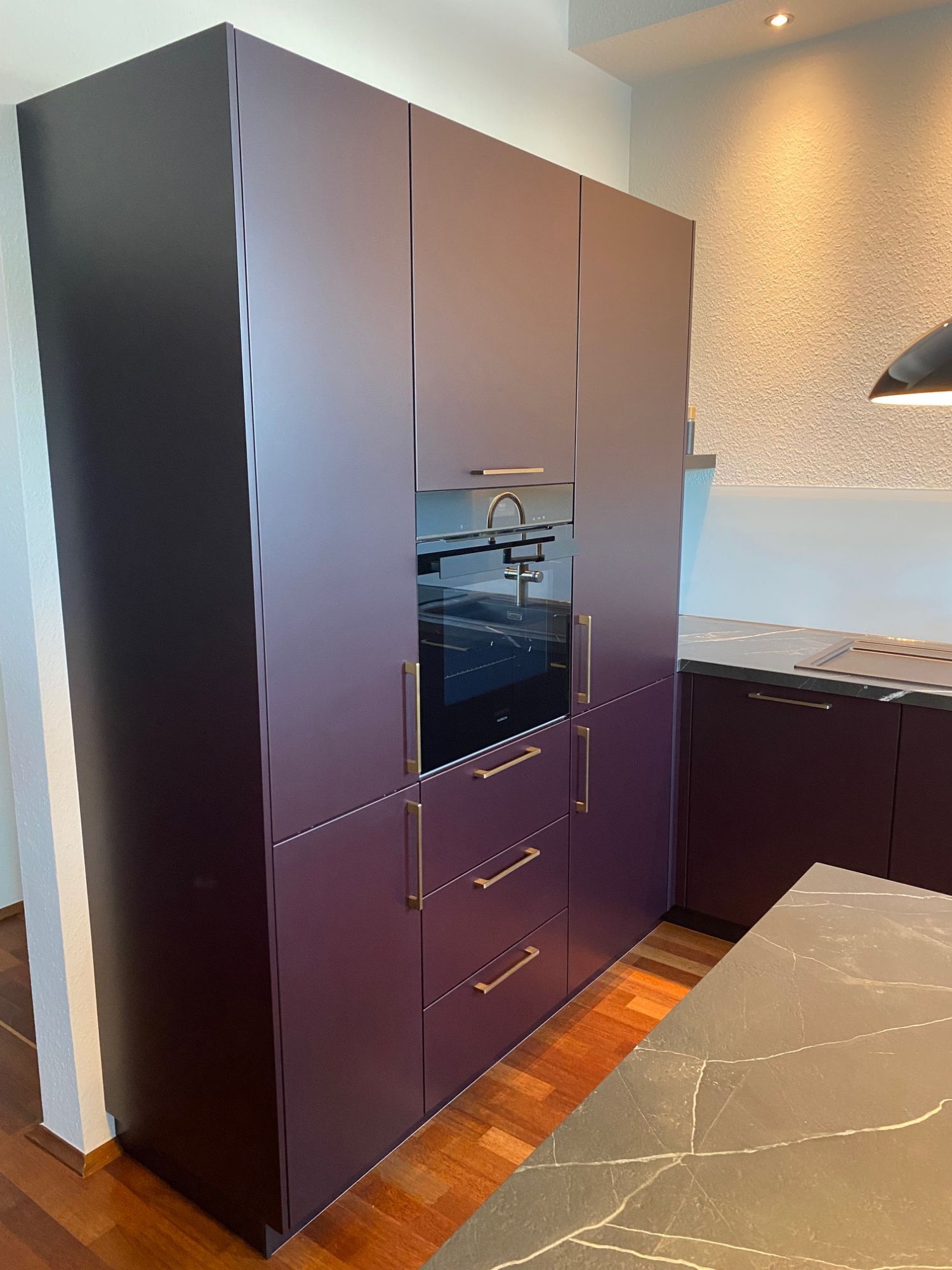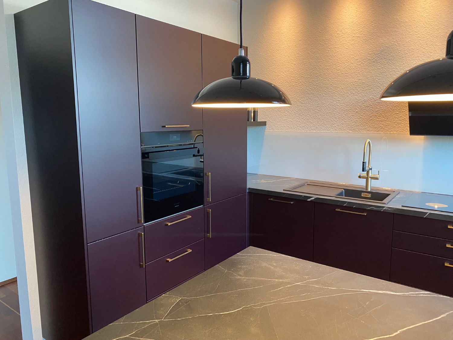 Die dunklen, matten Fronten im Farbton Blackberry setzen ein klares Statement und verleihen der Küche eine exklusive Note. Harmonisch ergänzt wird das Design durch die edel marmorierte Keramik-Arbeitsplatte der Firma Laminam in Calacatta Black, deren feine, helle Maserungen einen stilvollen Kontrast bilden.